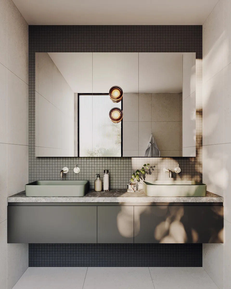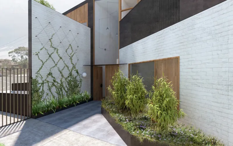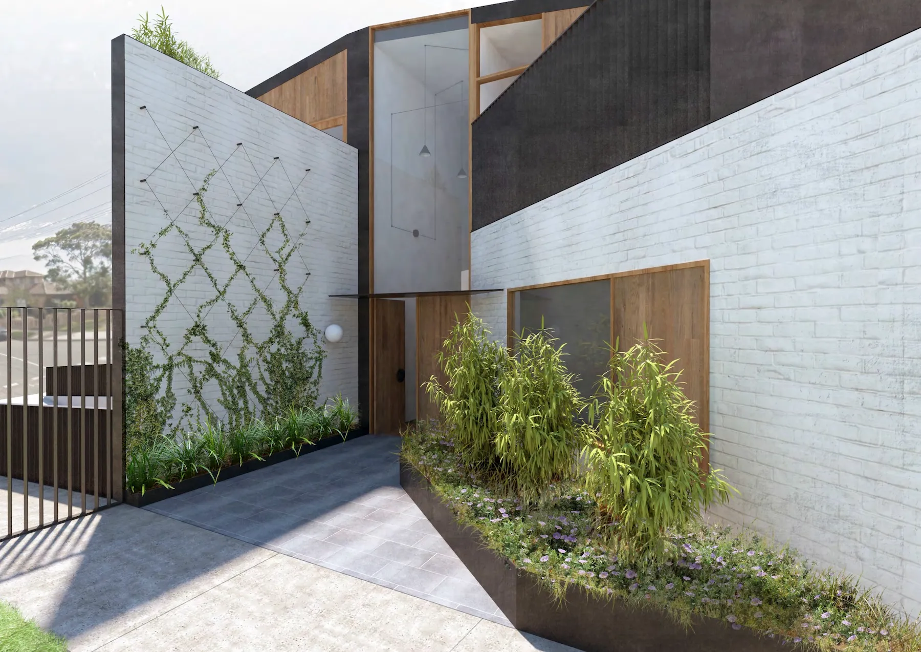 Architecturally dynamic, Afton presents a multi-level facade, with the use of texture, contrast and materiality playing individual roles. Rendered white and charcoal textures complement the dark Colorbond cladding and white brick. Silvertop Ash paneling and matching timber front door promote an organic aspect, with planters brimming with architecturally landscaped verdure and planting.