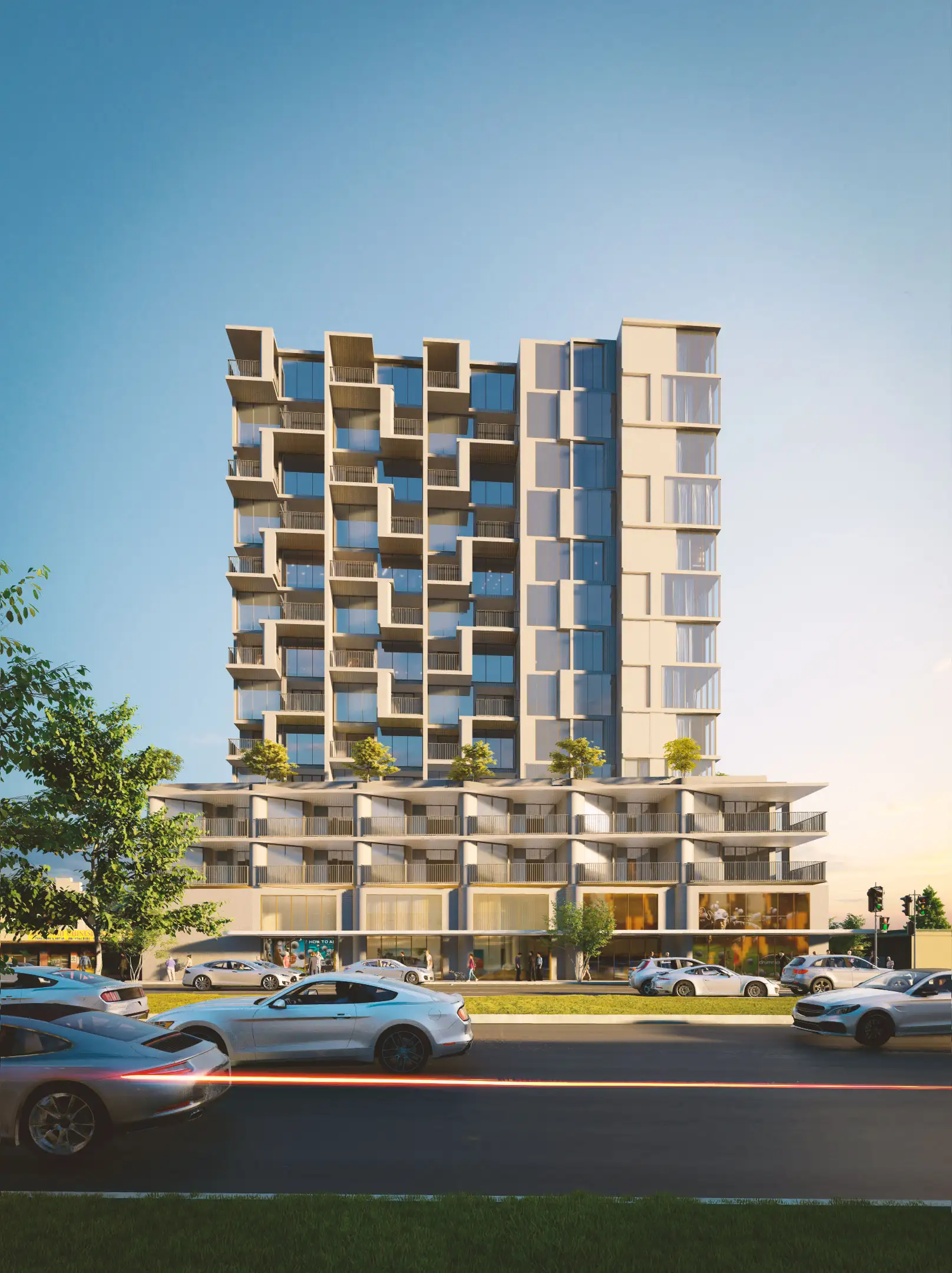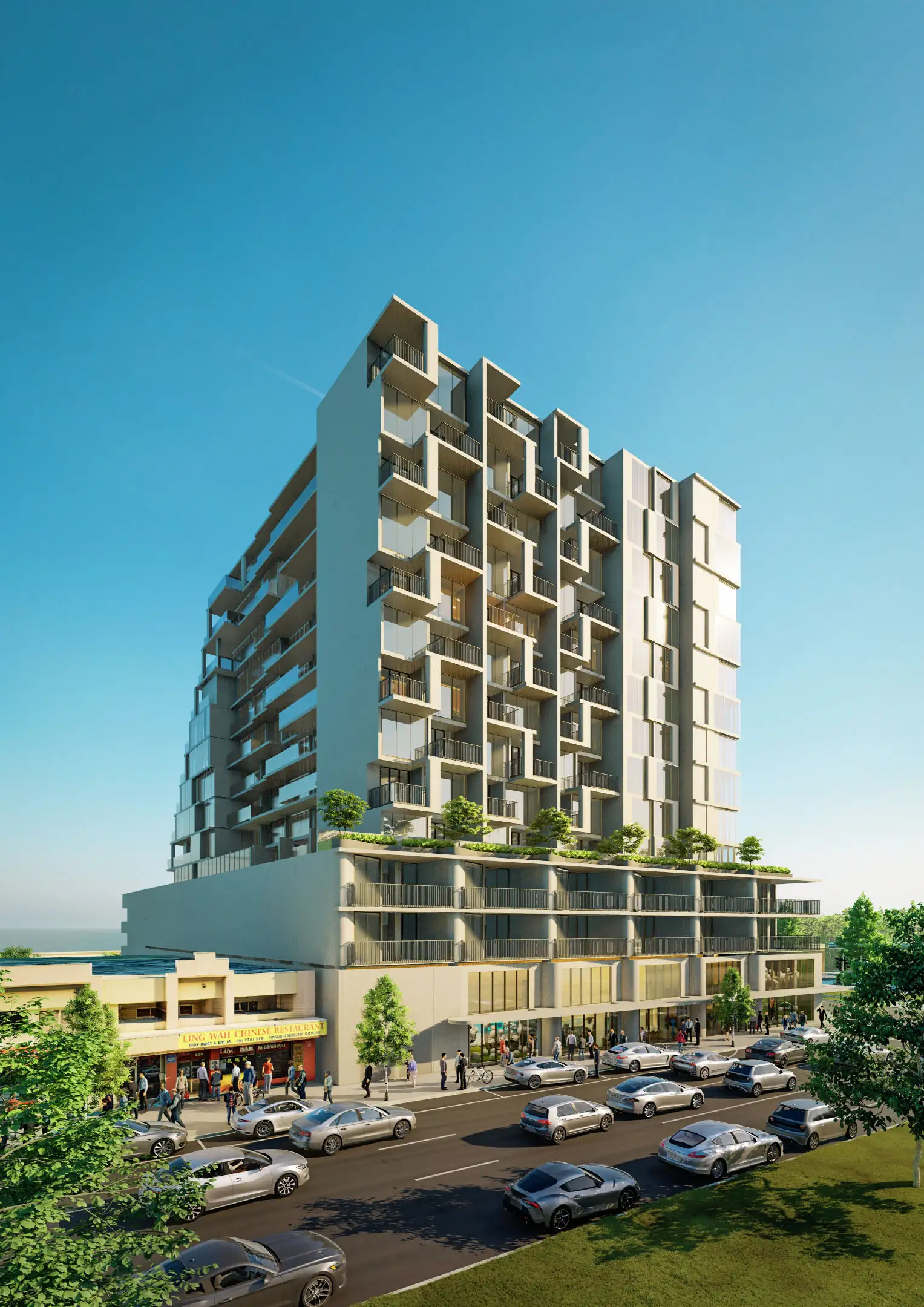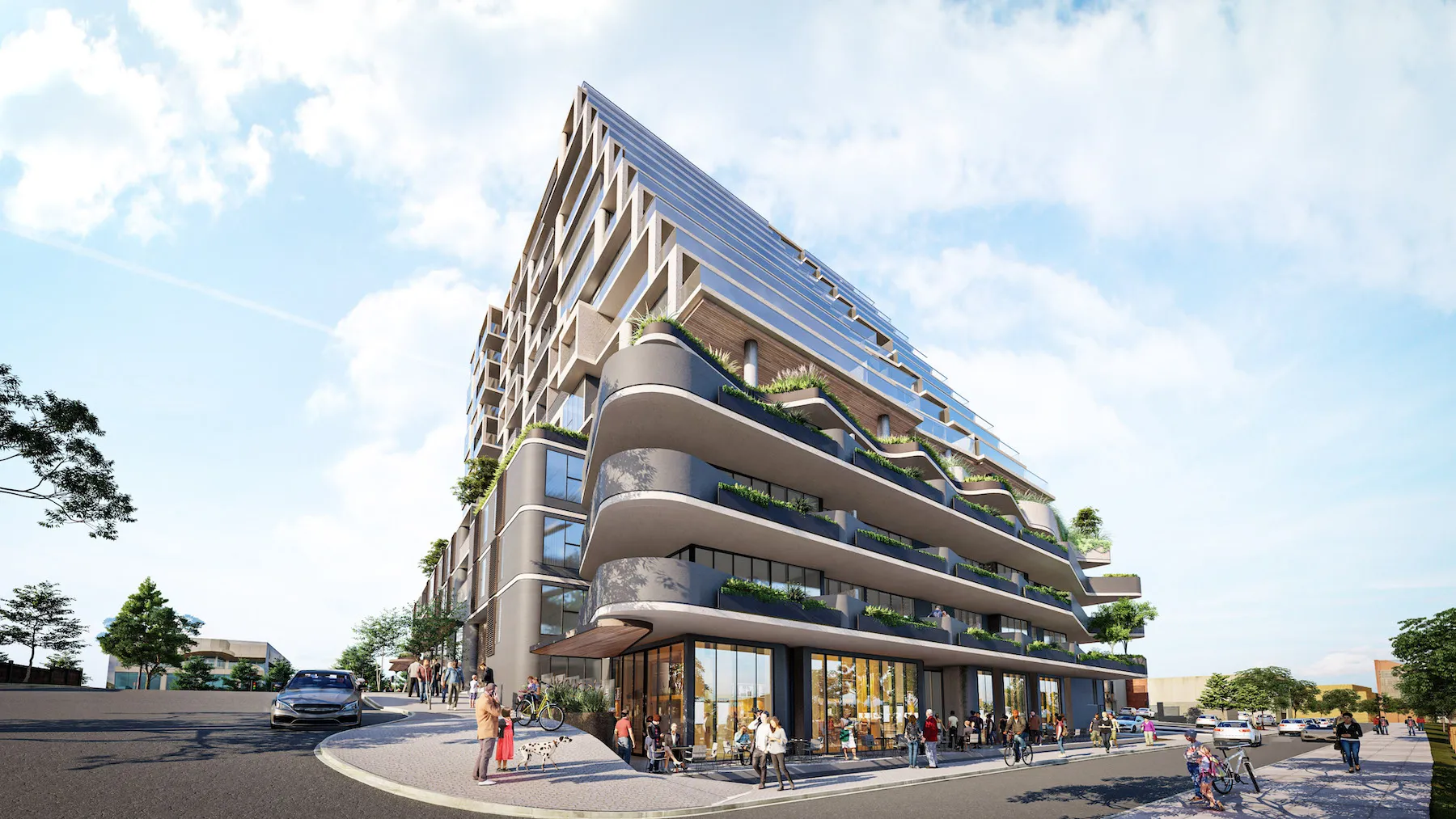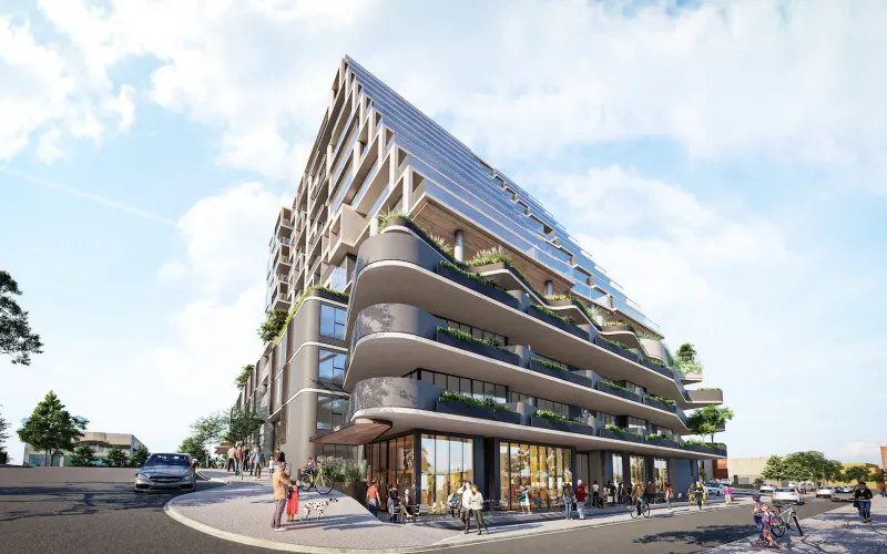 The overall scale of the development, at a maximum height of approximately 44.20 metres to the top of the building form, with eh upper most level setback from all sides below and generally concealed from the key viewpoints of the site. The proposal stands at 14 storeys and anchors the key entry point to the Major Activity Centre by addressing that corner with a strong architectural presence that then transitions away to respond to each of the site’s specific interfaces.