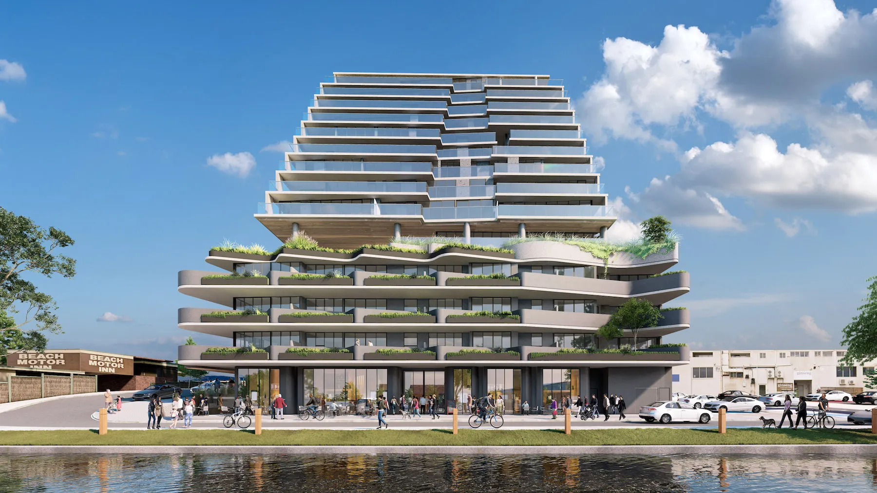Our proposal seeks to deliver an outcome that provides for active street frontages in the form of Retail tenancies to each of the site’s road frontages, with the removal of the previous “townhouse” style product onto Kananook Creek Boulevard, and it being replaced with additional retail tenancies, including outdoor dining opportunities, along that interface.